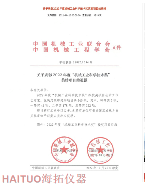 海拓儀器榮獲2022年度中國機械工業科學技術獎?ICC訊?10月20日,2022年度“中國機械工業科學技術獎”項目名錄正式發布,由海拓儀器(江蘇)有限公司完成的“超快速冷熱沖擊試驗系統關鍵技術研究與系列應用”項目榮獲2022年度“中國機械工業科學技術獎”三等獎。??據了解,中國機械工業科學技術獎是根據《國家科學技術獎勵條例》和《社會力量設立科學技術獎管理辦法》的有關規定,由中國機械工業聯合會和中國機械工程學會共同設立并經國家科學技術部批準,在國家科技獎勵主管部門登記的面向全國機械行業的綜合性科技獎項。旨在表彰在機械工業科技工作中作出突出貢獻的單位和人員,獎勵范圍包括:機械工業科學技術發明成果、機械工業科學技術進步成果、機械工業工程化和新技術推廣成果和機械工業軟科學和標準成果。??海拓儀器是一家集研發、制造、貿易于一體高科技現代化公司,公司成立于2005年,主要產品包括:超快速冷熱沖擊試驗機(熱流儀)、快速溫變應力篩選試驗箱(ESS), -